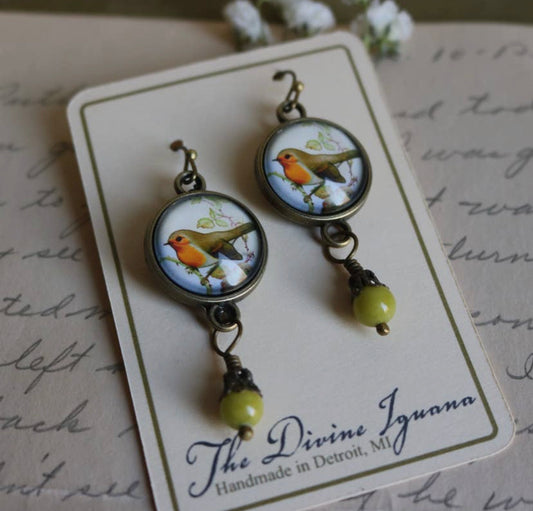 Spring Robin Bird Vintage Inspired Glass Cabochon Earrings