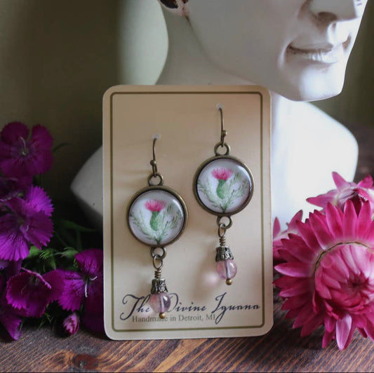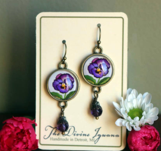 Purple Pansy Flower Glass Cabochon Earrings w/ Pearl Bead