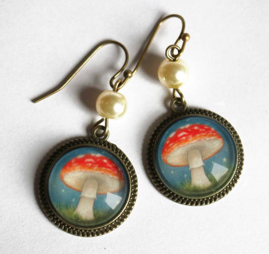 Moonlit Mushrooms Glass Cabochon Earrings W/Pearl Bead