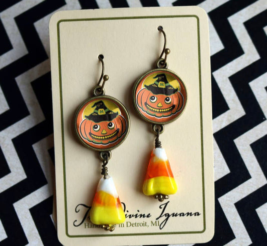 Retro Jack O Lantern in Hat Halloween Candy Corn Earrings